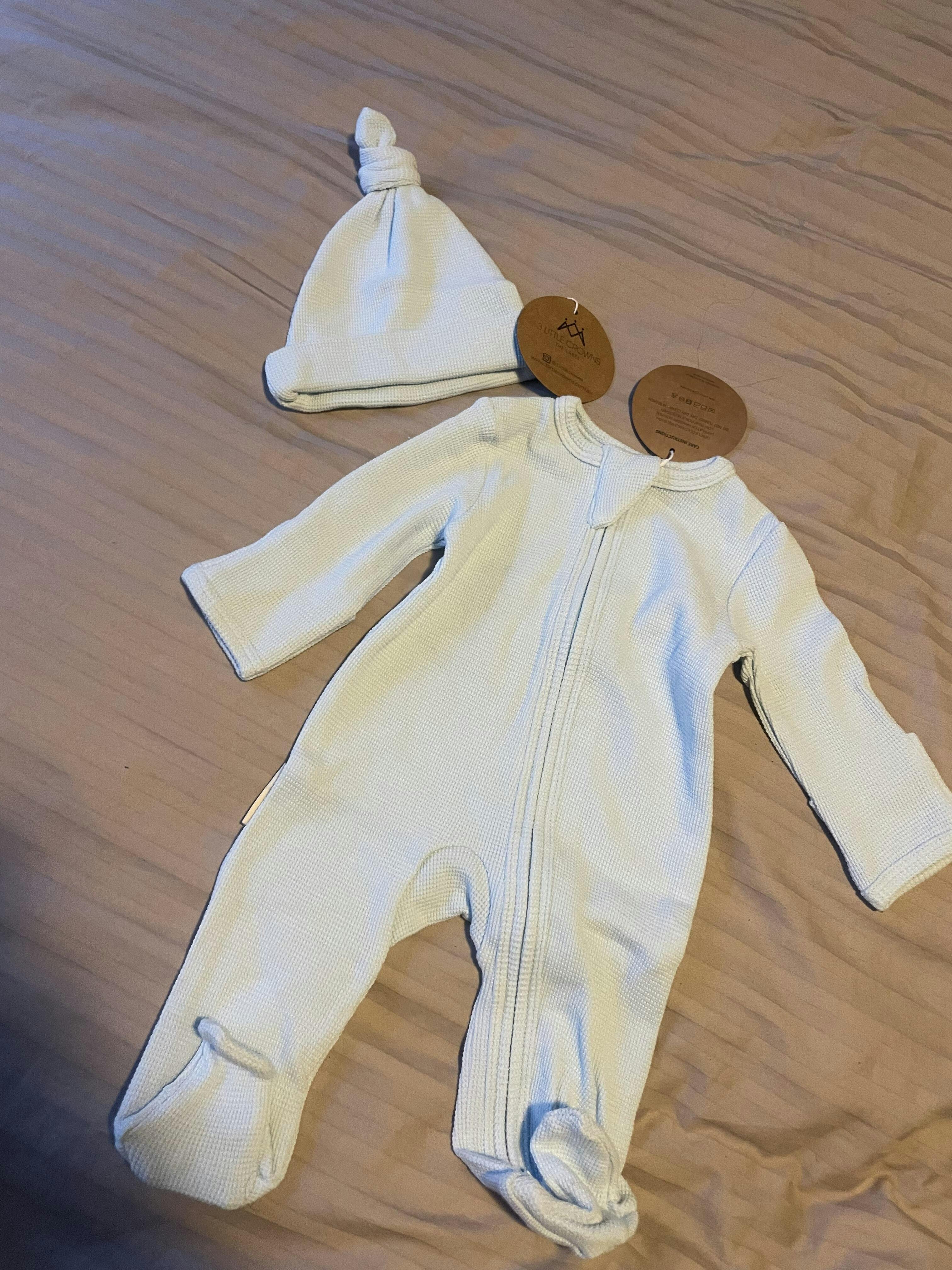 Premium Cotton Waffle Footed Onesie and Beanie Set